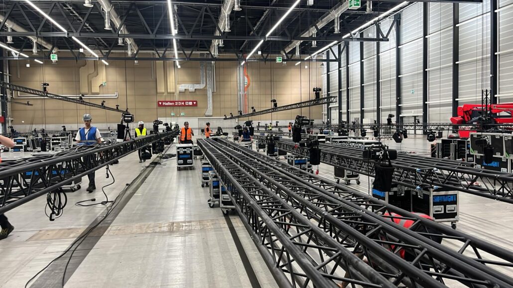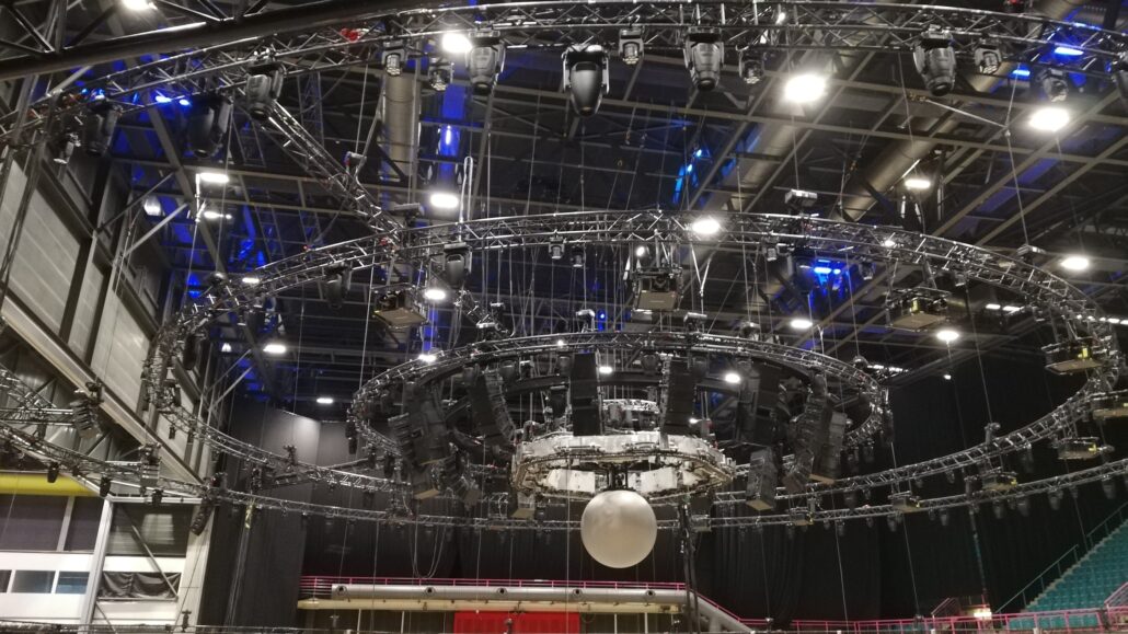 Clé de voute d’une installation, le grill technique, composé de poutres aluminium triangulaires ou carrées, peut être suspendu ou autoporté.